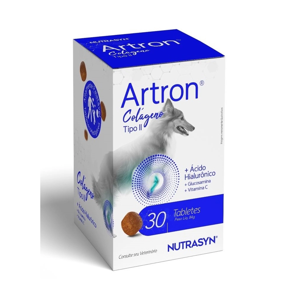 O Suplemento Vitamínico Nutrasyn Artron Tipo II para Cães é formulado para auxiliar na saúde das articulações dos cães. Sua composição inclui ingredientes como Sulfato de Glicosamina, Colágeno Tipo II Não Desnaturado, Ácido Hialurônico e Vitamina C. Esses componentes são conhecidos por sua capacidade de melhorar a função articular, promover a produção de colágeno e fornecer suporte antioxidante. O Sulfato de Glicosamina é um composto que desempenha um papel essencial na formação e reparação da cartilagem das articulações. O Colágeno Tipo II Não Desnaturado também é importante para a saúde das articulações, pois é um componente estrutural do tecido conjuntivo.
