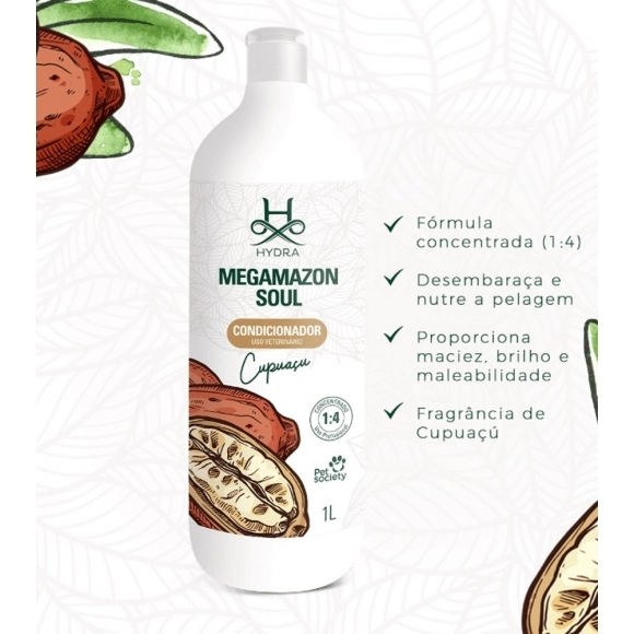 Uso tópico. Diluir o Hydra Megamazon Soul Shampoo em até 10 partes de água e aplicar o produto, massageando bem até formar uma espuma uniforme. Enxaguar e, se necessário, repetir a operação. Diluir uma parte do Hydra Megamazon Soul Condicionador em até 4 partes de água e espalhar por toda a pelagem, no sentido do crescimento dos fios. Enxaguar e secar. Finalizar com a Hydra Megamazon Soul Colônia.