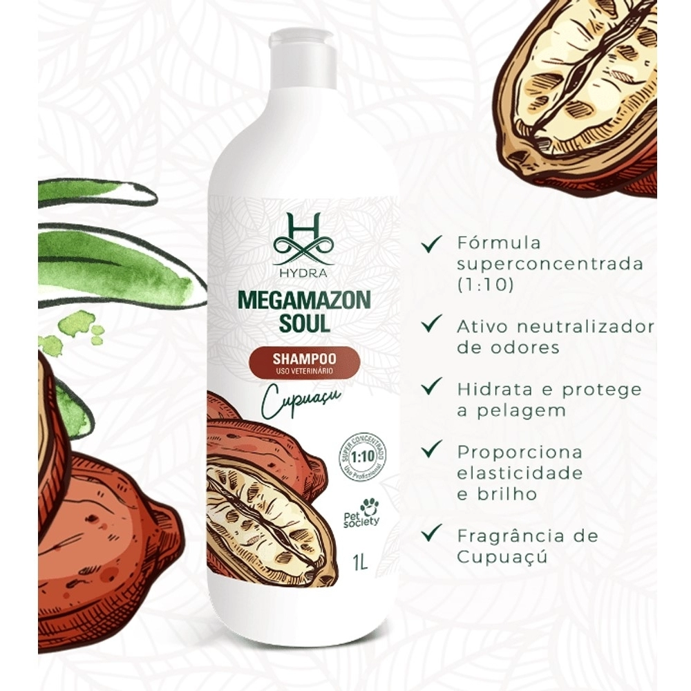Uso tópico. Diluir o Hydra Megamazon Soul Shampoo em até 10 partes de água e aplicar o produto, massageando bem até formar uma espuma uniforme. Enxaguar e, se necessário, repetir a operação. Diluir uma parte do Hydra Megamazon Soul Condicionador em até 4 partes de água e espalhar por toda a pelagem, no sentido do crescimento dos fios. Enxaguar e secar. Finalizar com a Hydra Megamazon Soul Colônia.